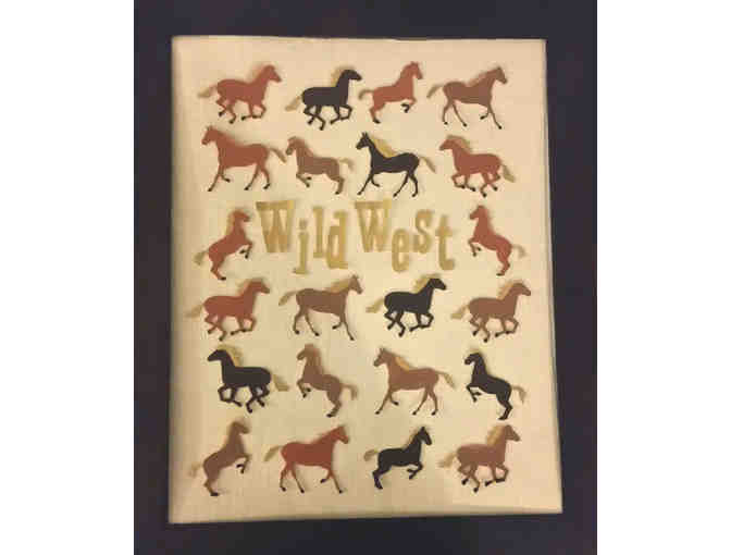 These are the majestic horses of the Wild West! Made with a "Yee-hah!" spirit by students from room 217. 15"x19" Framed art, unfinished wood, acrylic paint, burlap.