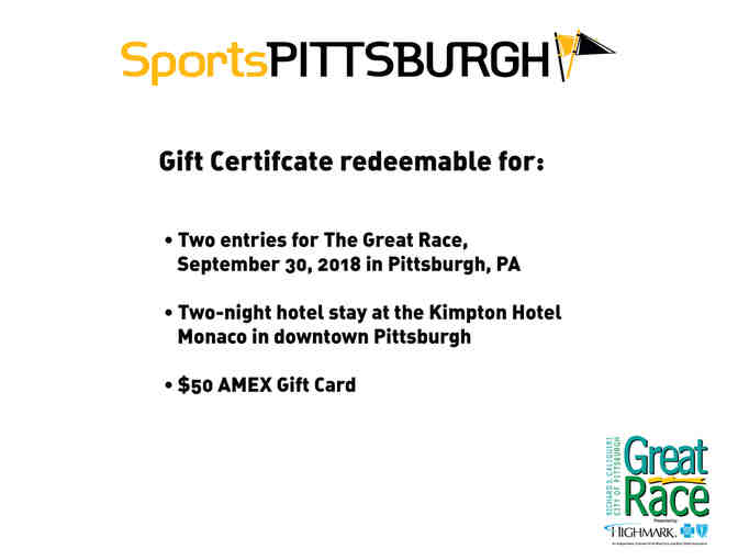 - Two entries for The Great Race, September 30, 2018 in Pittsburgh, PA - Two-night hotel stay at the Kimpton Hotel Monaco in downtown Pittsburgh - $50 AMEX Gift Card