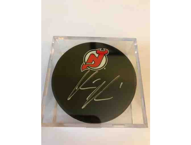 This NJ Devils hockey puck, autographed by goaltender Keith Kinkaid, makes a fine addition to any Devil's fan's collection!