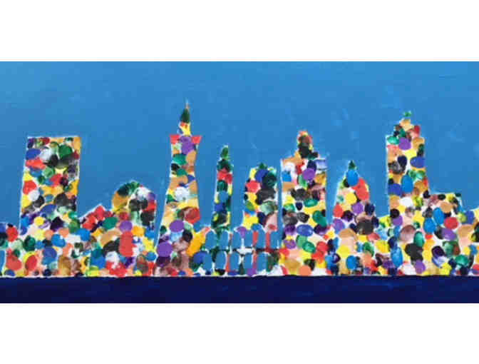Bid on this wonderful San Francisco Skyline (blue sky) 36"x24" canvas with colorful fingerprints by Mr. Barisonek's 5th grade class.