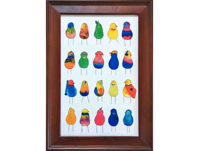 The lucky winner will receive a 11" X 17" " mahogany framed print of watercolor birds by artists in Room 201 - Ms. Li.