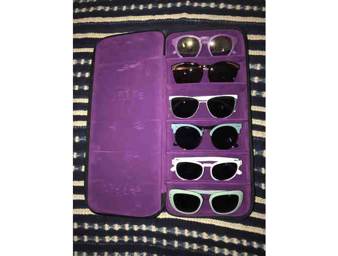 Each set includes 6 pairs of sunglasses and no sets are the same! Each set is valued at over $350. Perverse sunglasses set and travel case for unicorns who must carry multiple pairs wherever they go! This is perfect for festival season or a weekend in Palm Springs. This stylish protective travel case makes the jet set life available to anyone, and there are enough shades in this set for everyday of the week...besides Monday because who gets out of bed on Mondays anyways.