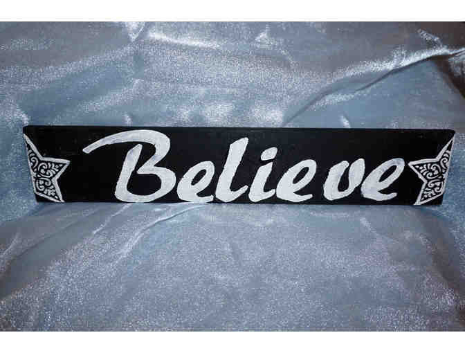 hand painted sign that says "believe", wood with black background, 17.75" x 3.25"