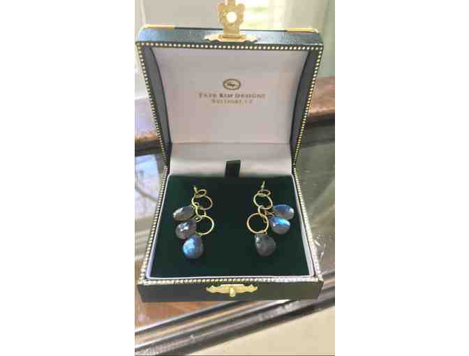 Be simply stunning. 18K Gold multi-level loop earrings with labradorite briolettes designed by local award winning Jewelry Designer, Faye Kim.
