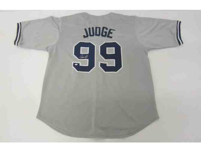 New York Yankees Jersey autographed by Aaron Judge #99, the notorious home run hitter who famously hit one out of the park in his first Yankees at-bat and hasn't stopped since. All rise.