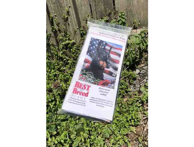 Spring/summer flag is a black and tan Doberman in front of an American flag and framed with spring and summer flowers.