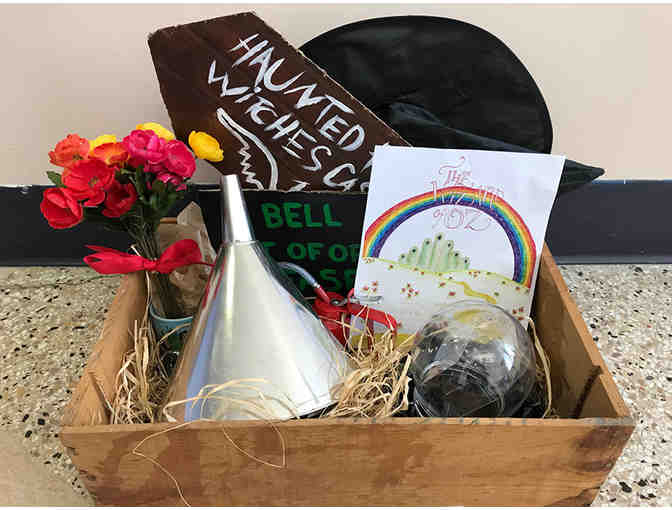 Now that Dorothy is safely back in Kansas, the 8th graders are happy to offer a basket filled with some of their play props and costume pieces. The wicked witch’s hat, green face paint and crystal ball, Tinman’s hat, oil can, silver face paint, and more will help youngsters (and oldsters) enamored with the Wonderful Wizard of Oz story bring it to life! (And if you really covet the complete Tinman costume, see Ms. Pierce!) Also included: A Wizard of Oz DVD!