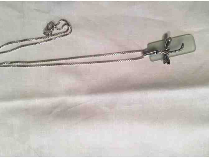 18" sterling silver chain with sea foam green cultured sea glass and dragonfly charm pendant.