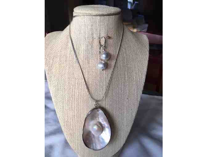 30" Sterling silver chain with handcrafted Sterling silver edged mother of a pearl half shell with 3/4" natural free form pearl. Matching natural free form pearl lever back earrings.