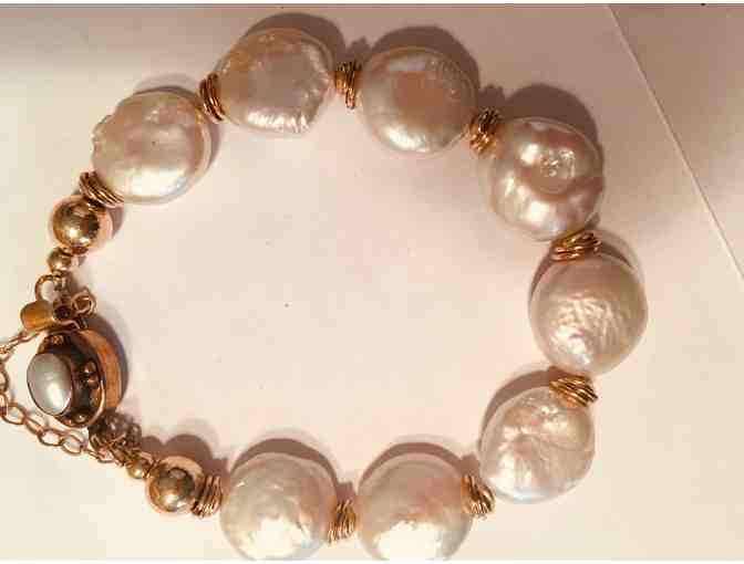 Bracelet of coin pearls with 18kt gold filled handmade clasp with safety chain.