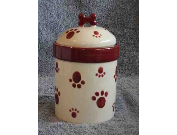 This is an 8” ceramic dog treats jar which is in excellent condition.