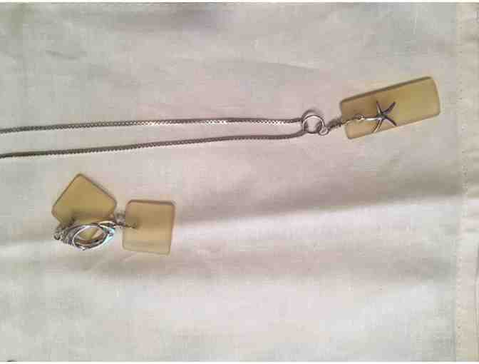 Necklace and lever back earring set. 18" sterling silver chain with yellow cultured sea glass and starfish charm pendant. Matching yellow cultured sea glass earrings.