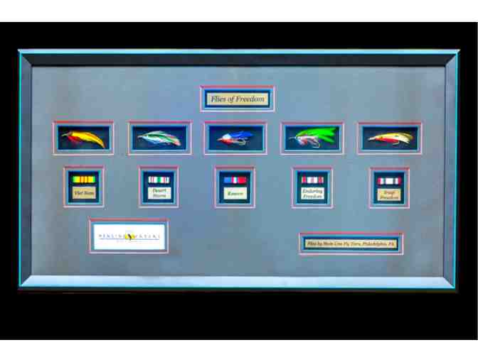 Double die cut shadowbox featuring 5 magnificent Rangeley flies tied by Main Line Fly Tyers,Philadelphia. Each original fly matches the campaign ribbon colors of a historic US military engagement. Perfect gift to a veteran of any of these conflicts - or any veteran organization.  One of a kind!
