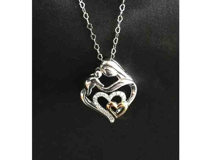 This pendant features a mother and baby crafted in sterling silver and surrounded by two hearts, one in sterling silver and featuring a total of 1/10 ct round-cut diamonds and accented by a smaller heart in 18K gold plate.