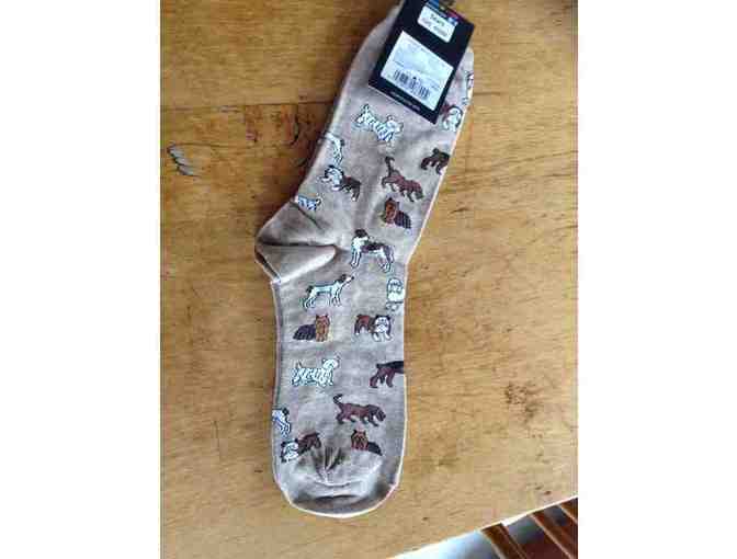 Adorable all over pattern of brown and white pups on a nice neutral beige background. Lots of stretch! New item - package undone to show pattern. Fits shoe size 4 - 10.