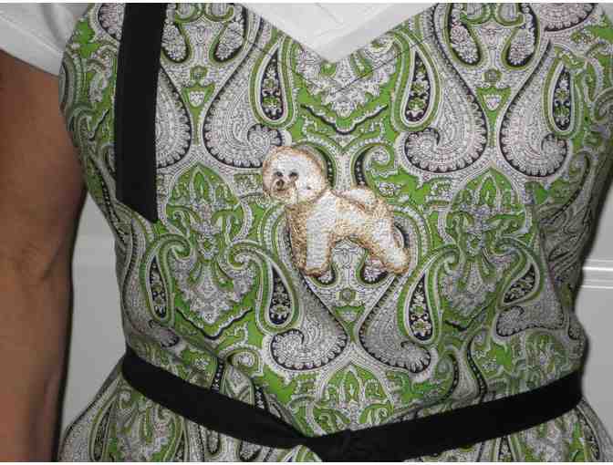 Beautiful apron with full body Bichon embroidered on the front. Material is green, white and black paisley pattern. Adjustable neck strap. Waist straps are long enough to tie in front or back and has front pockets.