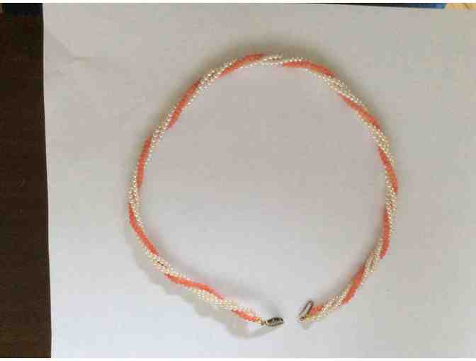 This seed pearl and coral 3 strand necklace measures 17 inches long.