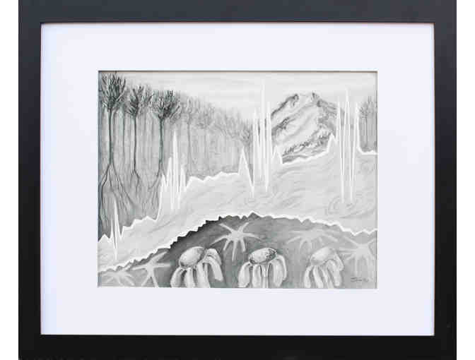 Disruption does not aim to represent the experience of being diagnosed with autism or epilepsy (or both). Rather, it seeks to express how conditions such as these can change the way life is perceived. The artwork disrupts images of nature by the use of an intrusive spiked EEG pattern that cuts across them. Parts of the brain are referenced as the flowers mix with astrocytes and trees branch out in a formation similar to neurons in the cortex. The use of the limited monochrome palette serves to exploit the tonal qualities of the ink while reducing the viewer’s sensory experience of normally colourful subject matter.