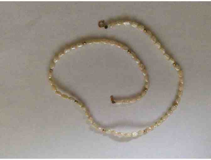 This freshwater pearl necklace has gold tone bead accents and measures 18 1/2 inches long.