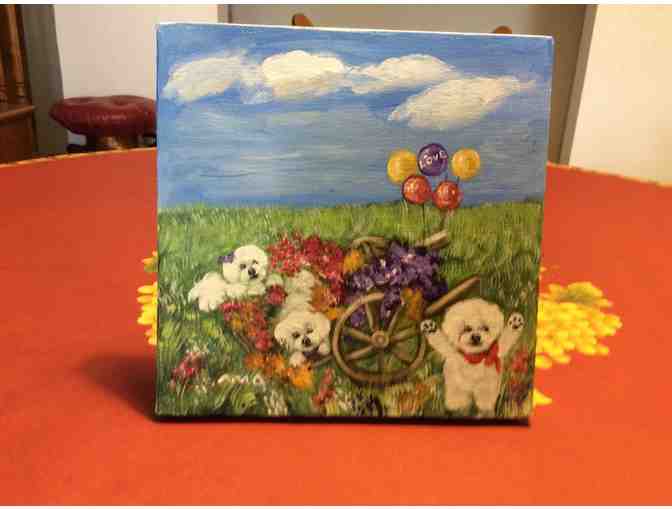 This adorable Bichon hand painting was created by artist Manuela Quick (Poookie). Just look at these 3 sweet Bichons frollicking in the wonderful meadow. What a beautiful day they chose...beautiful blue sky and fluffy white clouds. You can see each blade of grass and the detailed, delicate wildflowers near and inside their wagon. Plus there are 5 balloons tied to their wagon...maybe the are thinking of letting them go at the end of their day? Each Bichon is shown with their own personality. That’s Poookie’s specialty...the Bichon!