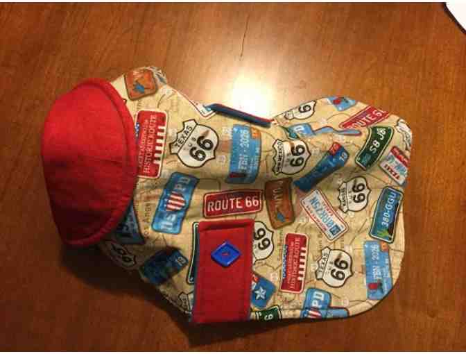 Custom made - fits dogs that are about 16" in length from the base of the neck (collar area) to the base of the tail. Washable on gentle cycle and lay flat to dry