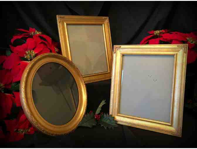 A collection of gold frames for hanging those favorite photos on your wall or sitting on a desk. Outside dimensions: 12.5" x 10.5". Picture dimensions: 9.5" x 7.5"