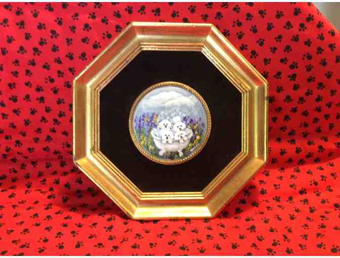 Poookie clear coated her painting to last. The frame is a pretty antiqued gold. The painting is on a background of a velvet material with a gold beading surrounding the painting. There’s a hook on the back for hanging. This painting is preowned and somehow the backing paper has been torn a bit. It would be very pretty for your own bathroom, but not as a gift due to the paper backing being torn....you might want to replace the paper to give as a wonderful gift. Overall the painting, octagon frame and background on front are perfect. The frame measures 7 1/2” each angle and the painting is 3 1/4”.