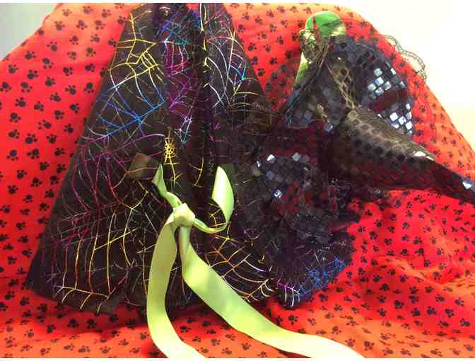 You may wonder why this group of Halloween Costumes is being offered in the Spring SPR Auction...the Christmas Auction would be too late for Halloween. Included in this group is a Witch, a Jester and a Devil costumes. The Devil costume consists of a red satin double sided cape and the little red plastic horn that you slide up over their nose to the top of their fluffy little head. The Jester costume has a colorful neck ruffle and a Jester hat. The ruffle is a double sided very colorful, red, blue, yellow and green diamond pattern with a yellow ribbon tie. The hat is oh, so sweet. Made of felt material. Very colorful, red, blue, green and orange with an elastic strap under the chin. The Witches costume is my favorite! It’s adorable! The cape is a small black netting see through material. It’s covered with iridescent colorful, gold, blue, pink, silver and green spider webs. With a green ribbon tie. The Witches hat is exceptional! It is a black material with little square sequins on the outside. It has a lace ruffle around the outer edge of the hat. Has material stuffed I side the hat and sewn closed so the point doesn’t droop. Closes with a green silk ribbon.