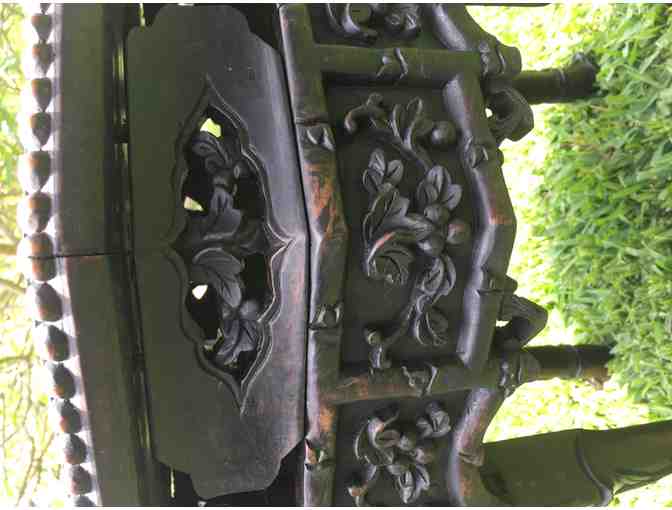 Featuring intricately hand-carved Chinese motifs into the dense rosewood, the design consists of foliage and flowers. The top is inset with marble and was most commonly used in its day as a stand for a fish bowl or large container for plants. The whole is set upon legs terminating in dragon clawed feet with raised borders.