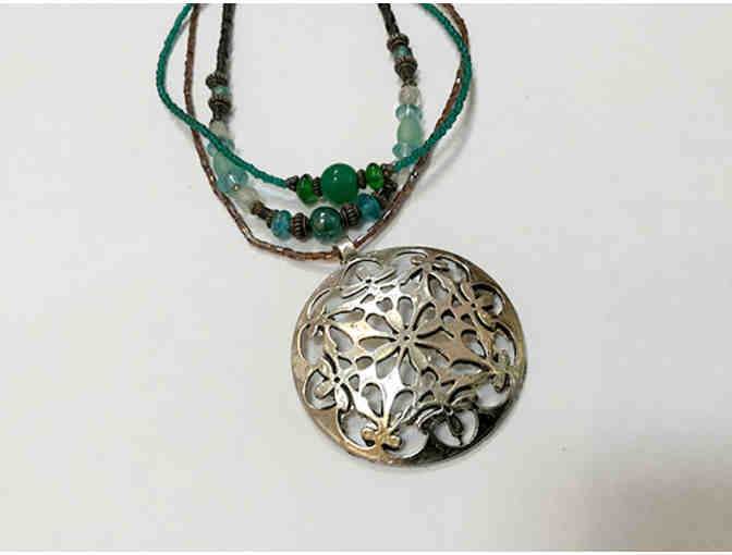 Beautiful hand beaded necklace with large medallion pendant. Handmade with earth toned beads and large silver accent. Adjustable toggle clasp closure. 10" drop with an 20" total length.
