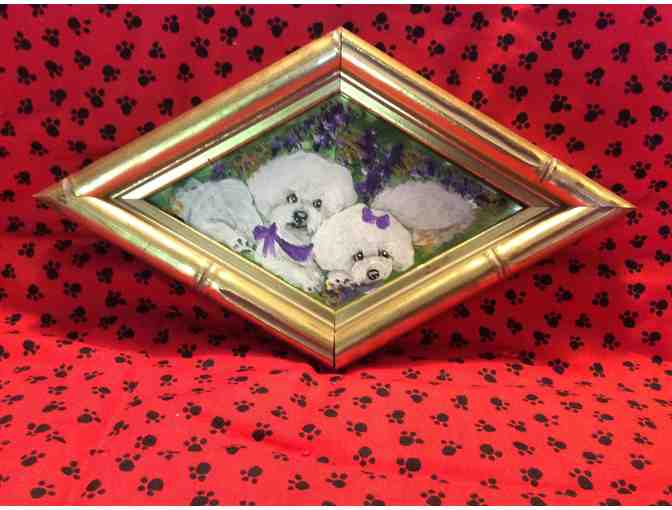 The painting is framed in a pretty antiqued gold, Rohmbus shaped frame, which measures 10” wide X 6” high. The painting itself measures 6 1/2” wide X 3 1/2” high. The painting is ready to hang with hooks on the back. Frame is made by Cape Craft. Condition is new...would make a wonderful gift for any Bichon lover. The painting is clear coated to last.