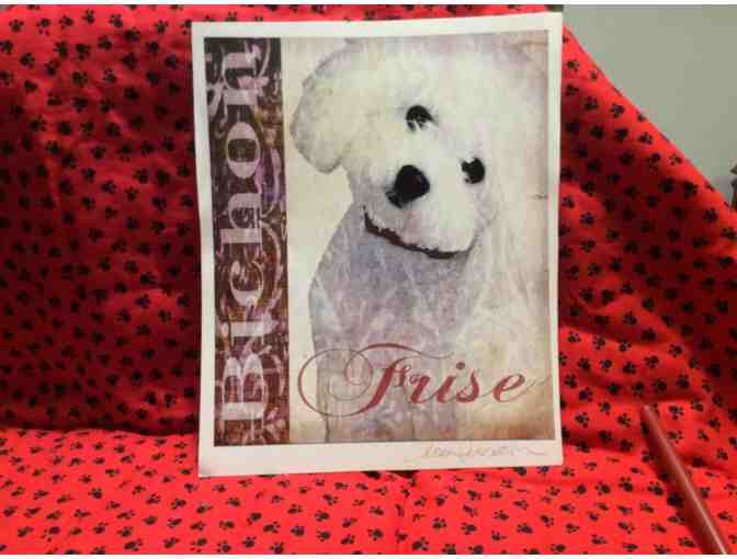 The print measures 8” wide X 10” high. It’s printed on high quality paper all ready for you to frame and hang on your wall. No frame is included. No blemishes or boo-boo’s. Condition is new, but has been displayed. Would make a terrific gift for a new Bichon owner!