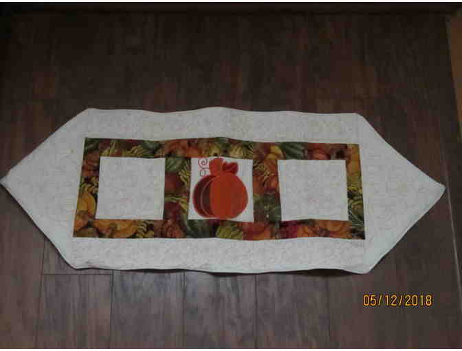 Fall table runner with appliqued pumpkin center and machine embroidered finish. Will enhance any table.
