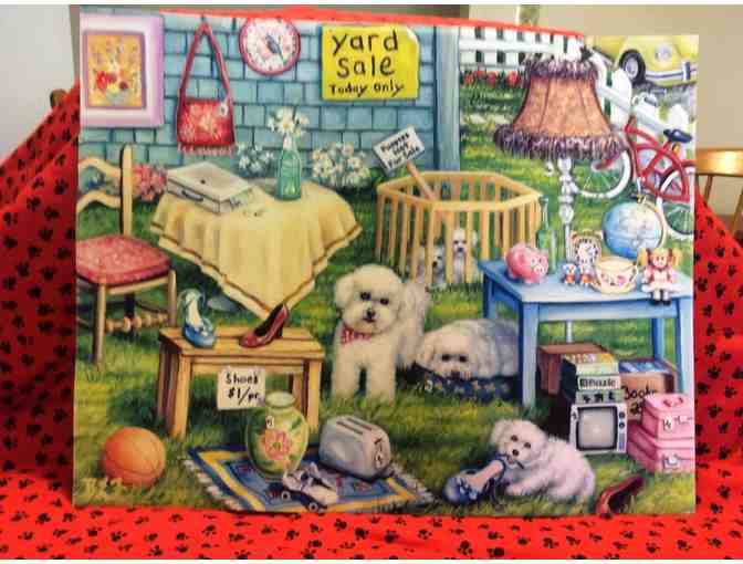 This cute Bichon print is ready to frame and hang on your wall. It measures 11” X 14” and I’d done by Brook Faulder. It’s in perfect condition and would make a terrific gift for any Bichon lover. Look at all those sweet fluffseach doing their part to help out. One poor little guy doesn’t want to sell his doggy bed for $5.00!