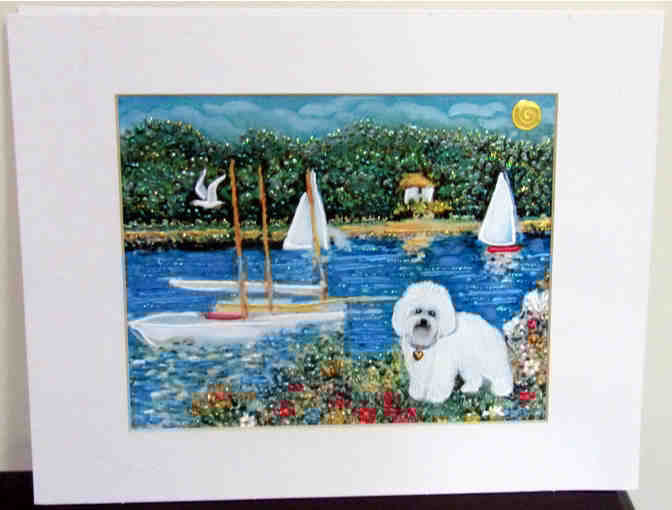 Another take on a Monet scene of enhanced by an adorable Bichon. Hand-painted silk-screen is 8" x 10"