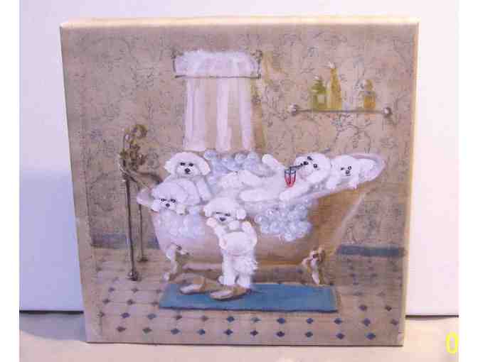 This 9"x9" streched canvas Bichon Hand painted artwork is done by me Manuela Poookie Quick with acrylic paints and sealed to last.The Bichons are having a blast