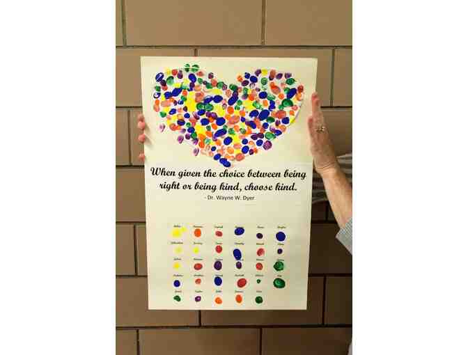 Fingerprints representing each child put together to make one heart with the message: "When given the choice between being right and being kind, choose kind." This piece is on poster board ready to be framed and is 14"x22".