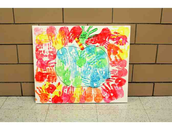 Students in K-103 created an apple with their handprints. The class uses tamper of different colors, the space in the canvas and the position of their hands to transmit their daily enthusiasm and classroom experiences. They show us their talent, and collaboration, using a Big Apple theme. This piece is on canvas and is 24"x20".