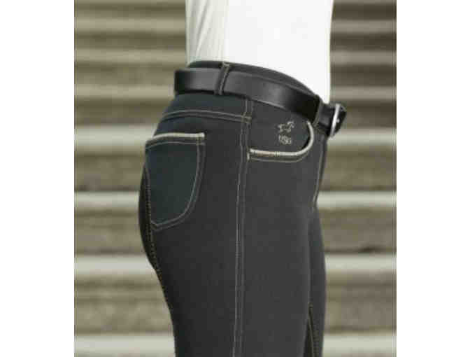 Women's equestrian breeches by USG. These are black on black with lighter colored detailed stiching.