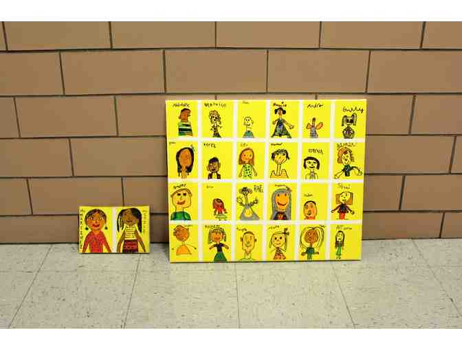 Students as well as teachers created self-portraits. The students' portraits are on a large canvas 24"x20" and teachers' portraits are on a small canvas 9"x6".