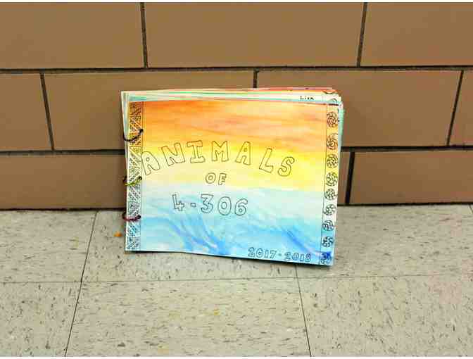 Students in 4-306 voted to complete an animal project that would show a glimpse of their favorite animal's life. Depending on whether the animal was nocturnal or diurnal, students painted a background in watercolors. They created a ground using India ink. They worked on an outline of their animal along with a vegetation found in the animal's environment. They used a thin marker to outline both shapes. Last, they created a border on the right side that would add to the composition. Finally, all pieces of art were attached to make a beautiful book that represents the animals of 4-306. The project was fun yet challenging.