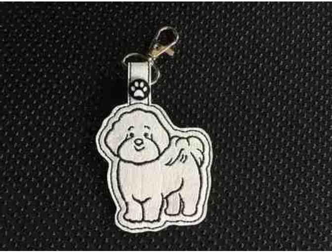 Bichon key ring. White vinyl on front. Black vinyl on back. Embroidery done by me on my embroidery machine.