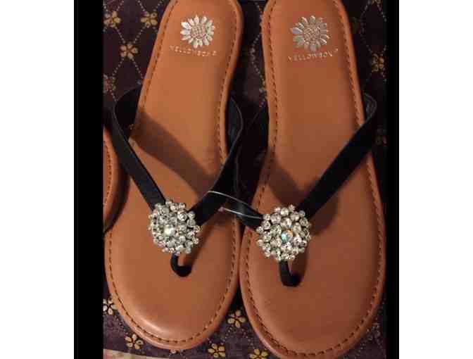 New - Women’s Sandals (flats), black straps, with rhinestone medallion in the center.