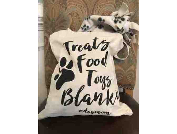 SEND YOUR FUR BABY OFF TO BOARDING OR VACATION WITH THEIR OWN TOTE. 16.5"H X 15.5" W CANVAS TOTE. BLANKET NOT INCLUDED.