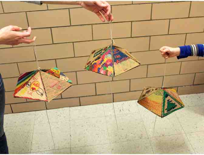 This ambitious piece is a set of 3 decahedrons with each triangle expressing the stylings of individual students. They can be hung together or separately. These 3 pieces are made of cardboard with each decahedron 11" in diameter.