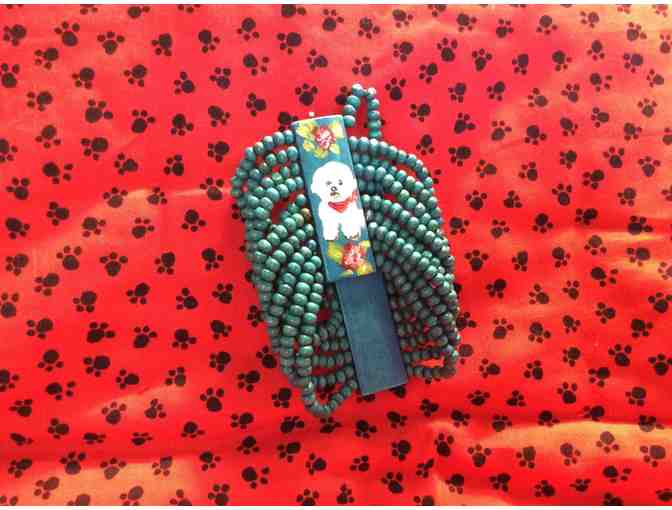 This is a must have for your Summer wardrobe accessorie. It has a happy little Bichon, hand painted on each side of the bracelet by artist, Manuel Quick, Poookie. The Bichon are surrounded by pretty little pink roses and green foliage. There are 10 rows of wooden beads on a stretchy line attached to each piece of wood front and back. As you can tell it’s a bit hard to describe, but oh, so cute. It’s a very pretty medium colored turquoise.