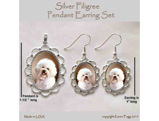 Silver-plated. They are very lightweight and dainty. Made in the USA Pendant is 1½ inches long. Earrings are 1 inch long. Pendant is 1 1/2” long.