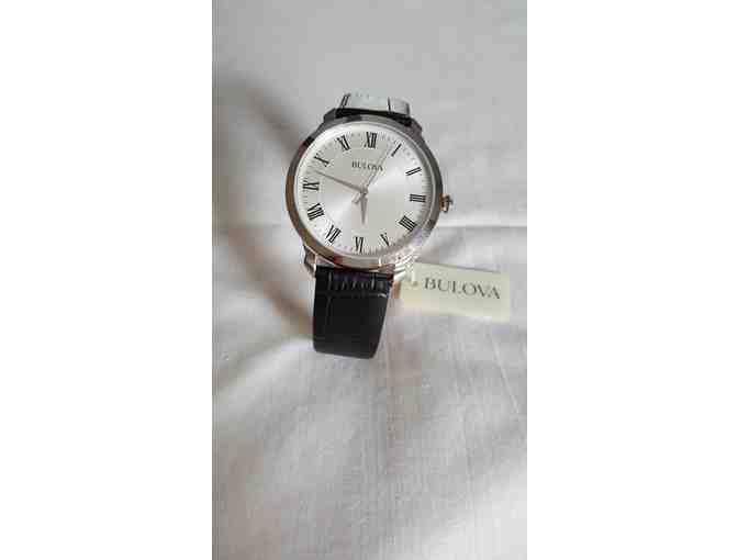 New unused Men's Bulova watch w/ black leather strap. Stainless steel. Water Resistant.