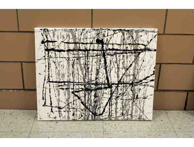 Students in K-109 created this abstract art piece inspired by Jackson Pollack using marbles. This piece is on canvas and is 16"x20".
