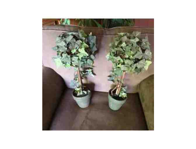 2 pretty ivy covered topiaries in green pots. 7" wide by 18" tall